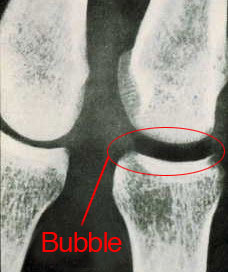 Bone x-rays that show the effects of rapid decompression on the body. Left=normal bone, right=bone with bubble.