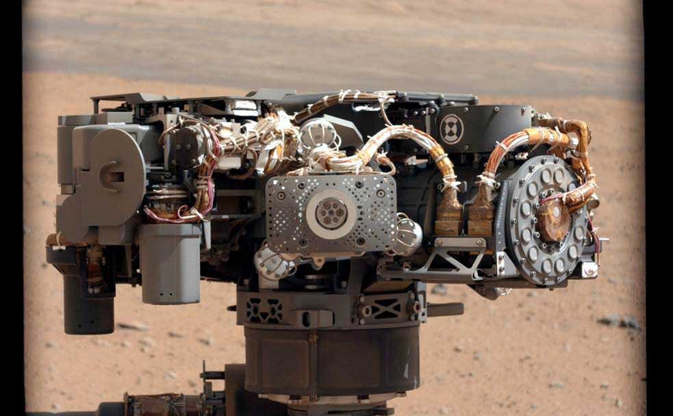 Located on the end of the Curiosity rover's robotic arm, the sensor is placed close to a sample, which it bombards with X-rays and alpha particles (charged helium nuclei) to study the properties of the energy emitted from the sample in response.