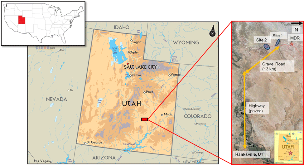 Figure C.1: The field site is situated near Hanksville, Utah, USA, in the area of Kissing Camel Ridge. Basic amenities such as hotels, restaurants, supermarket and hardware store are available in Hanksville, and it is assumed that field teams will seek accommodation there. The nearest airport is Grand Junction, CO (via Denver, CO).