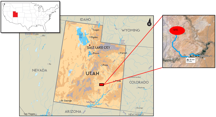 Figure B.1: The field site is situated near Hanksville, Utah, USA, in the area of Kissing Camel Ridge. Basic amenities such as hotels, restaurants, supermarket and hardware store are available in Hanksville, and it is assumed that field teams will seek accommodation there. The nearest airport is Grand Junction, CO (via Denver, CO).