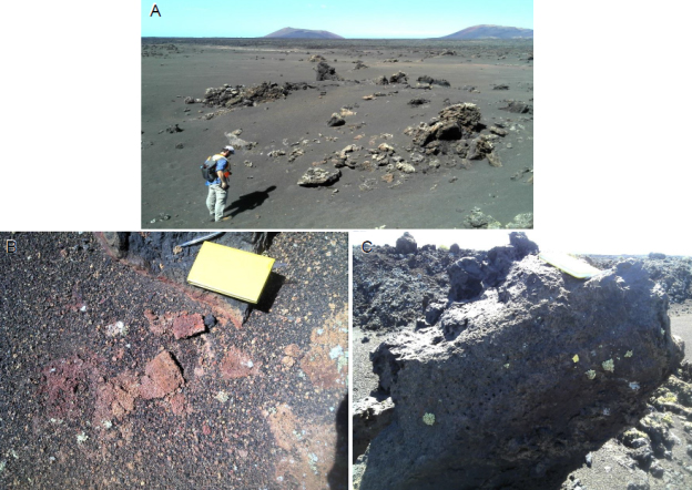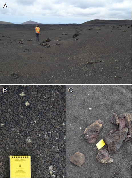 Figure 3: Tintaguan South. The site is situated close to the town of Tinajo (approximately 2 km) and the Timanfaya visitor centre (1.7 km south) (29°1'13.30"N / 13°42'51.91"W). Access to the site is a gravel/dirt road with scattered blocks of lava flows ranging from 5 cm to 30 cm. This site is used by the ESA's PANGAEA course (Image A). The site is characterised by lapilli regolith (2-64 mm sized volcanic fragments, Image B), and, low vegetation cover, with some lichen cover on regolith and outcrops, and relatively high rock abundance with lava flow fragments scattered across the regolith (Image C). Olivine-rich xenoliths are encased in the lava flow outcrops and fragments.