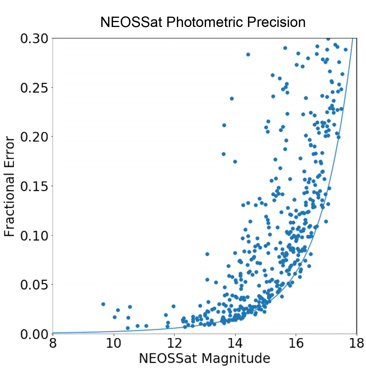 Figure 5 NEOSSat photometric error as a function of magnitude based on a star field near star Kepler K1625 (mag 14). This figure illustrates that the photometric precision is below 0.05 for stars brighter than magnitude 14 and the fractional errors increase exponentially for fainter stars. (Credits: Jason Rowe, Bishop's University)