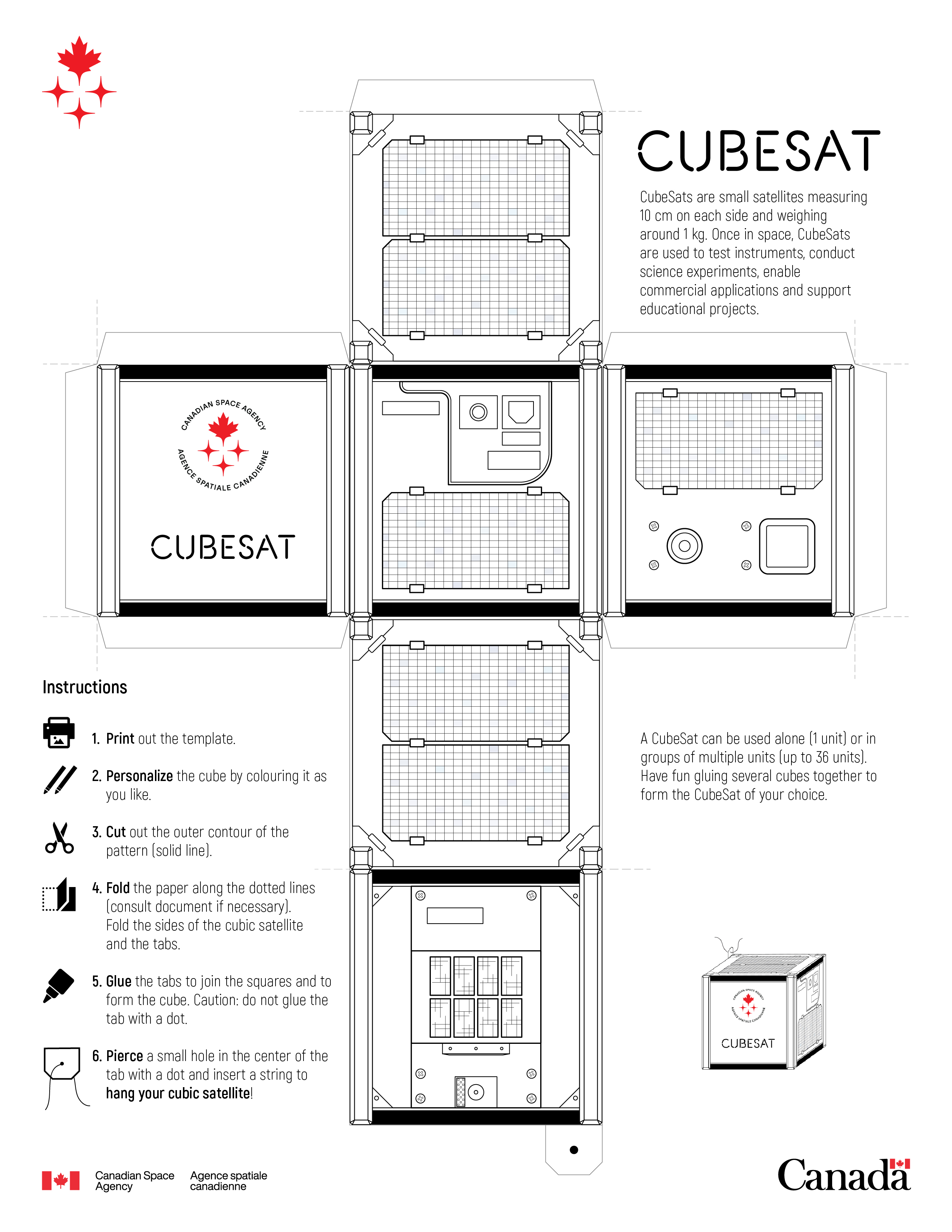 Illustration of a model of a small cubic satellite. One of the six squares features the name CubeSat and the Canadian Space Agency logo. On the outside of the model are instructions and the following graphics: a printer, two pencils, a pair of scissors, a sheet of paper folded in half, the point of a marker pen, and a label with a hole in it and a string. There's also a short description of the model, and a representation of the assembled cube.