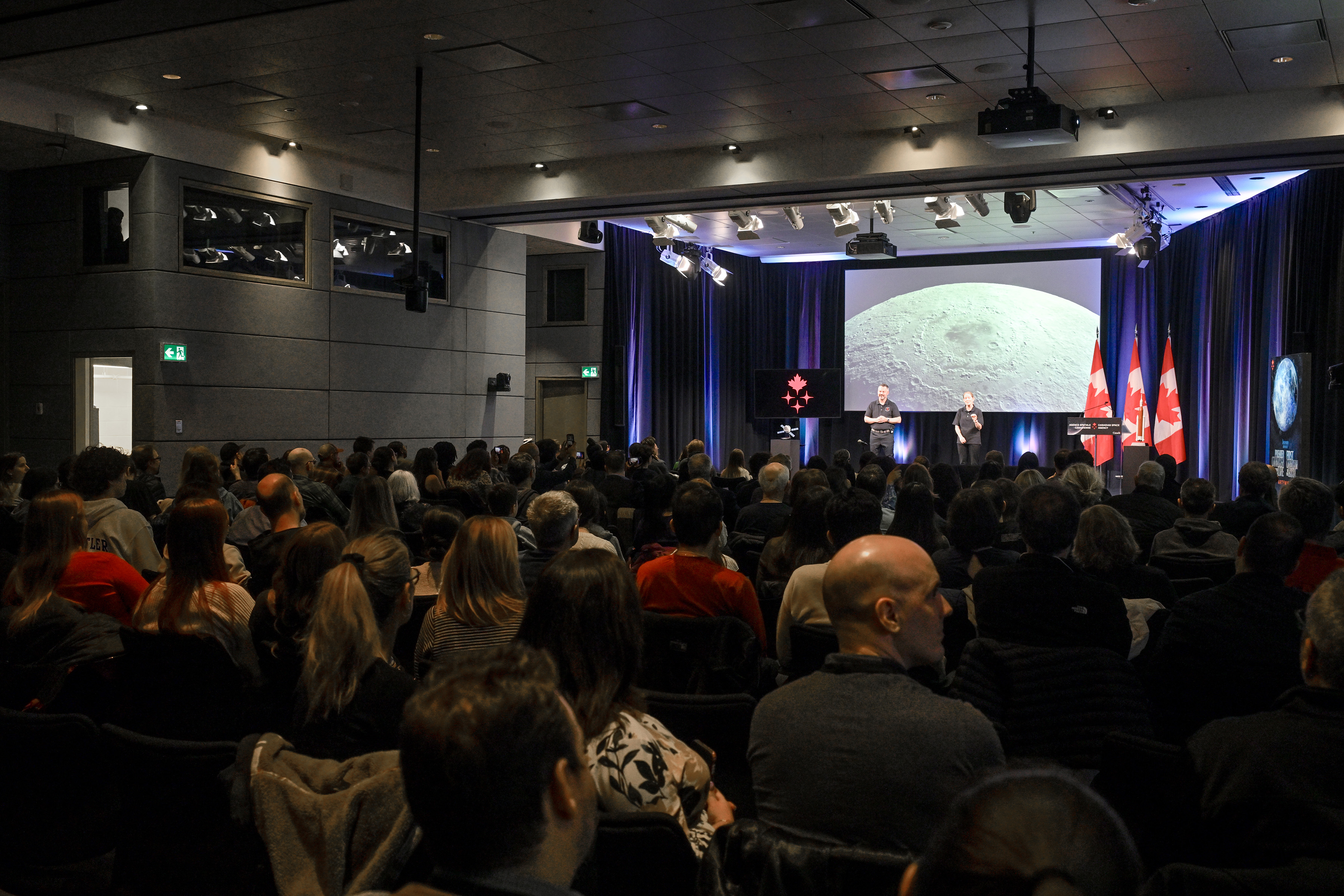 Many people gathered at Canadian Space Agency headquarters in Longueuil, Quebec, to watch a live space-to-Earth connection during the Artemis II mission. (Credit: Canadian Space Agency)