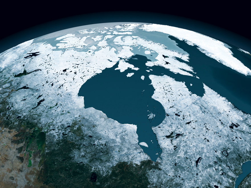 The large body of water is Hudson Bay. The narrow passage leading to it is Hudson Strait, through which Captain Stokes navigates using RADARSAT data. (Credit: Media Bakery)