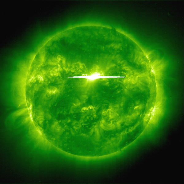 This solar flare, captured by the SOHO satellite, is called Bastille Day flare because it happened on July 14. It's one of the most powerful flares observed until now. (Credits: NASA, ESA)