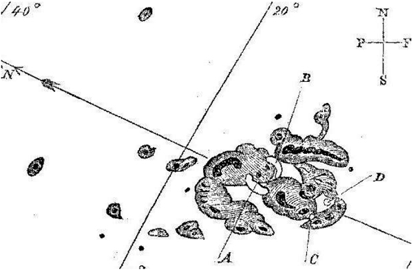 The solar flare observed by Carrington on September 1, 1859. Only the strongest flares can be detected in the visible spectrum. These are seen as two small white spots (A and B). Solar flares are more easily seen in other parts of the spectrum (for example, ultraviolet). Observations are now made from space because the Earth's atmosphere obscures the view from the ground.