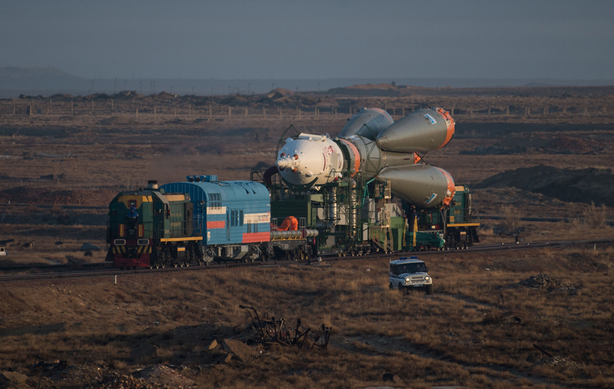 The Soyuz rocket is transported from the hangar to the launch pad. (Credit: NASA)