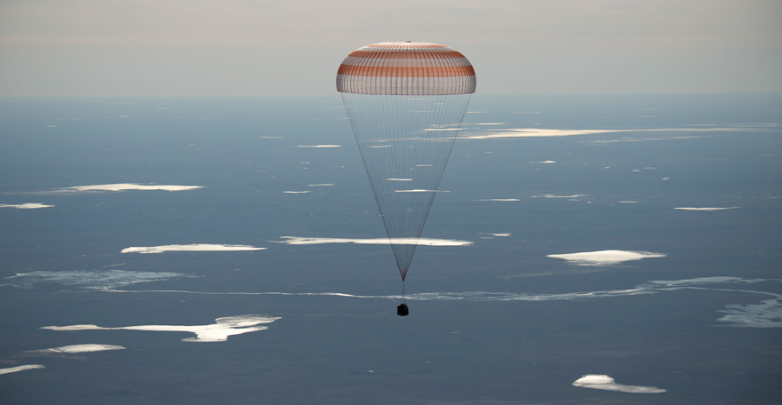 The Soyuz chutes are deployed for landing over the Kazakhstan steppe. (Credit: NASA)