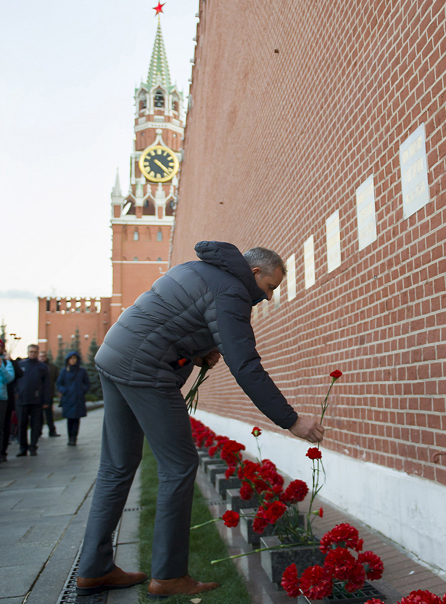 Canadian astronaut David Saint-Jacques lays flowers at the Kremlin Wall in Moscow where Yuri Gagarin, the first human in space, and other Russian space heroes are interred. (Credit: NASA)