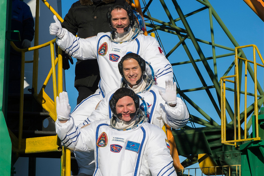 Canadian astronaut Chris Hadfield and his Expedition 34 crewmembers take part in the crew press conference one day before the launch. (Credit: NASA)