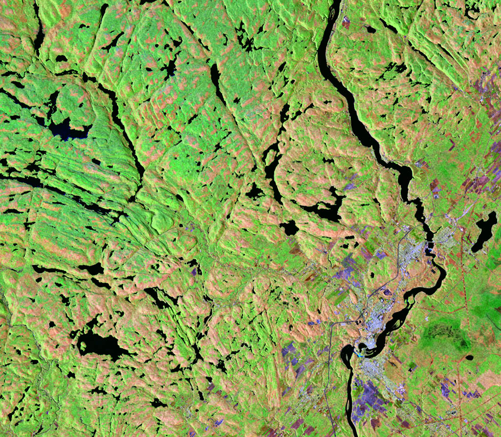 The lower half of this Landsat-8 satellite image shows the Athabasca oil sands, in Alberta. It is the world's largest known reservoir of crude bitumen. (Credit: USGS/European Space Agency)