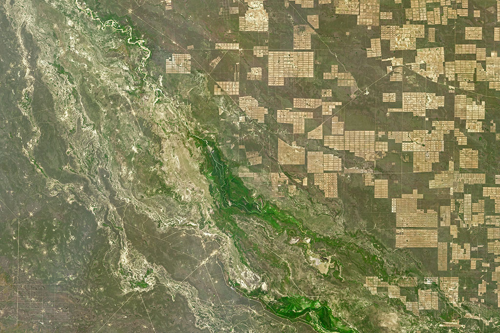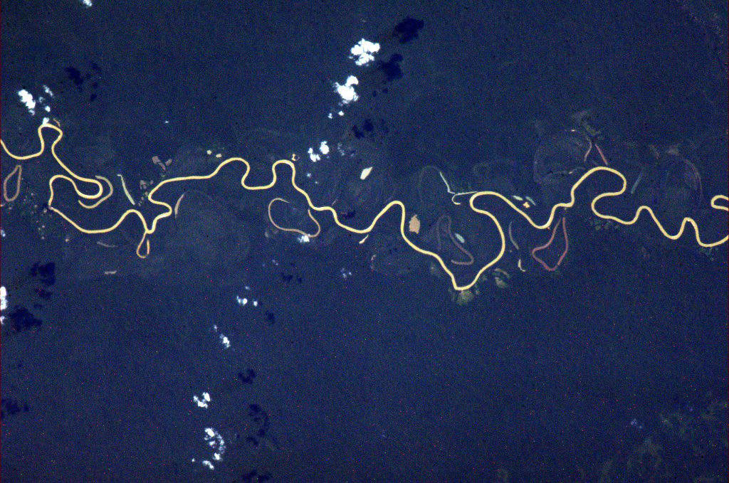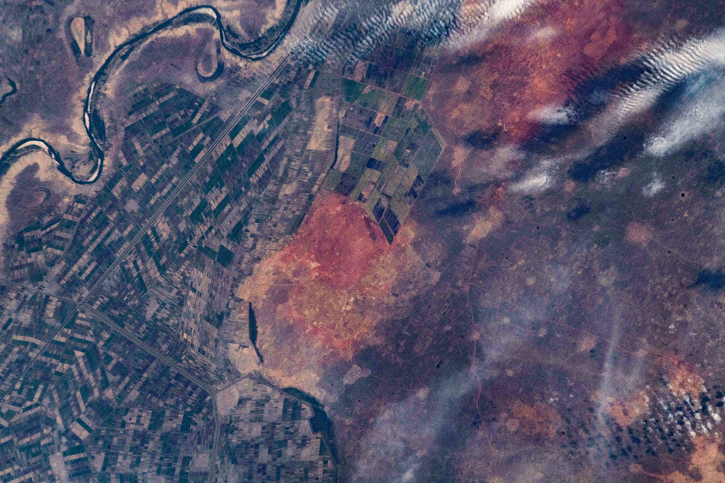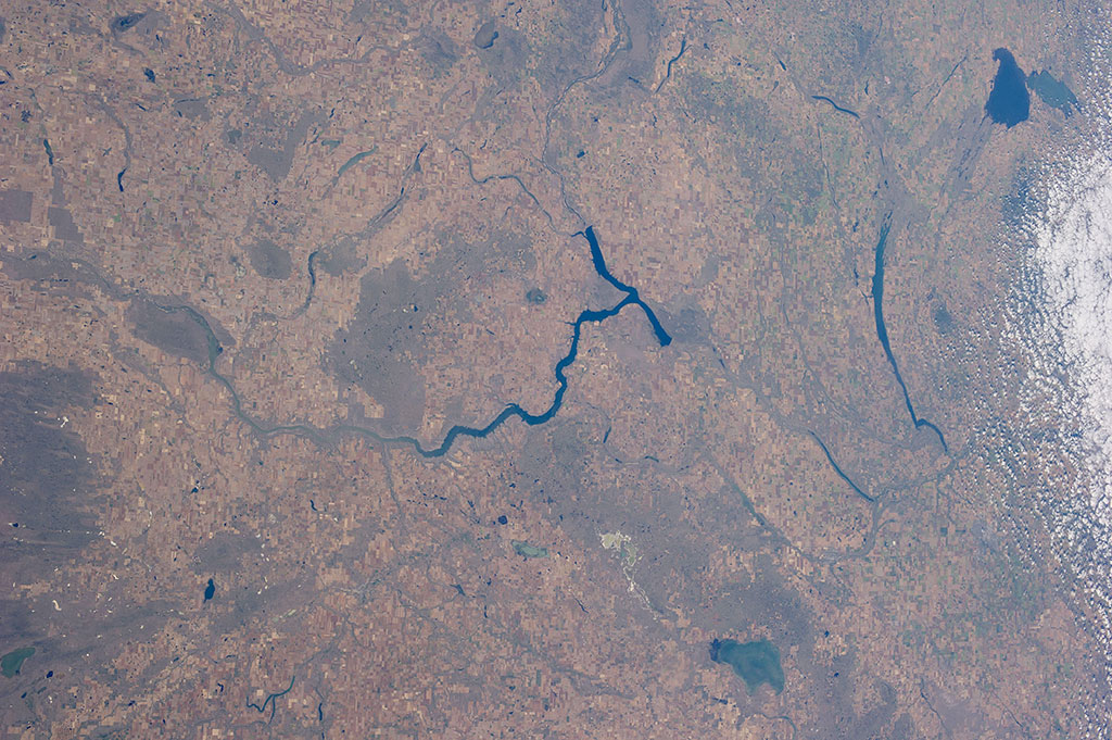 The Senegal River is a 1,086 km long river meandering in West Africa. It forms the border between Senegal and Mauritania. Lake de Guiers, in Senegal, is also seen in this picture captured by David Saint-Jacques from the International Space Station. If you look closely, irrigation systems (circles) and fields (green rectangles) can be seen on the left of the lake. (Credit: Canadian Space Agency/NASA)
