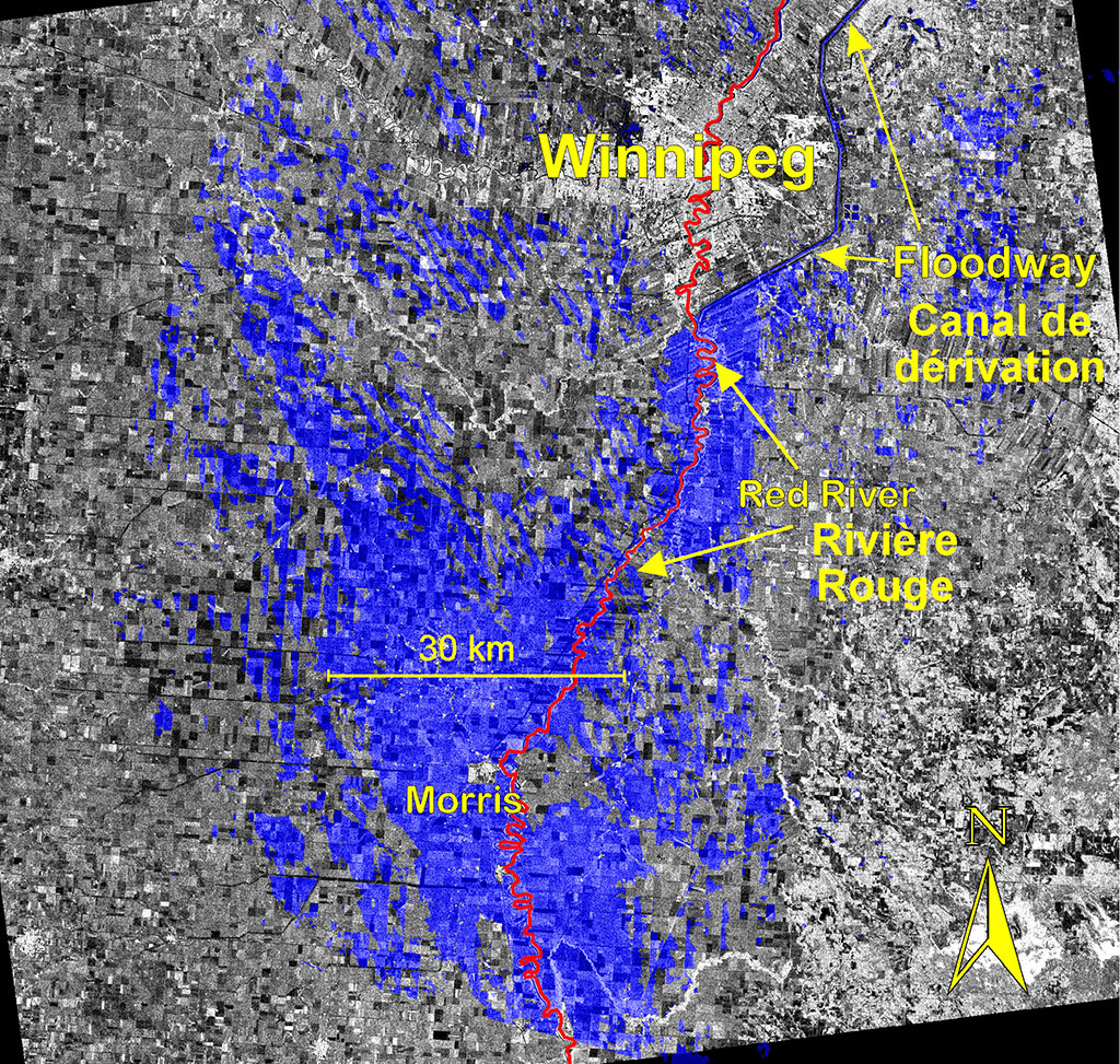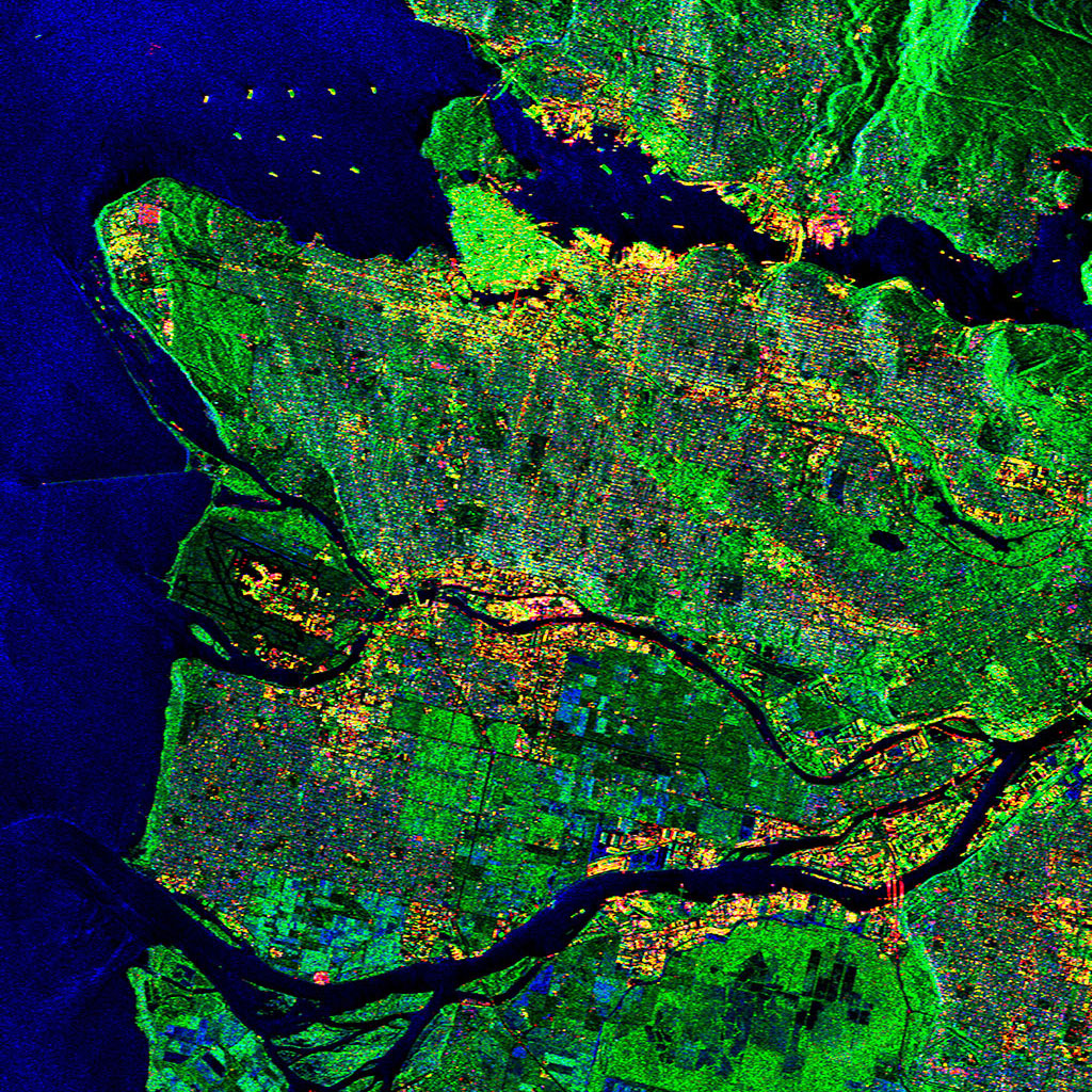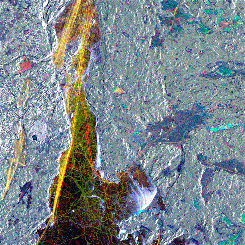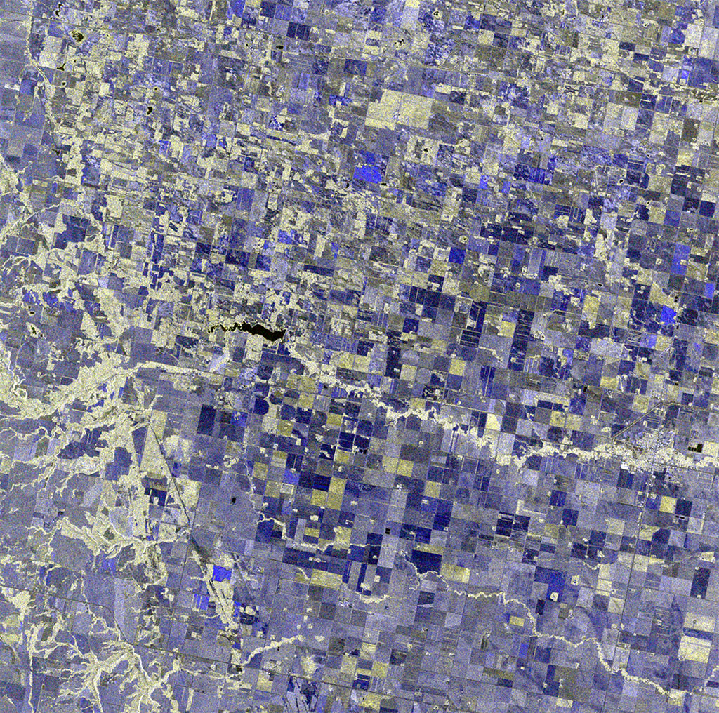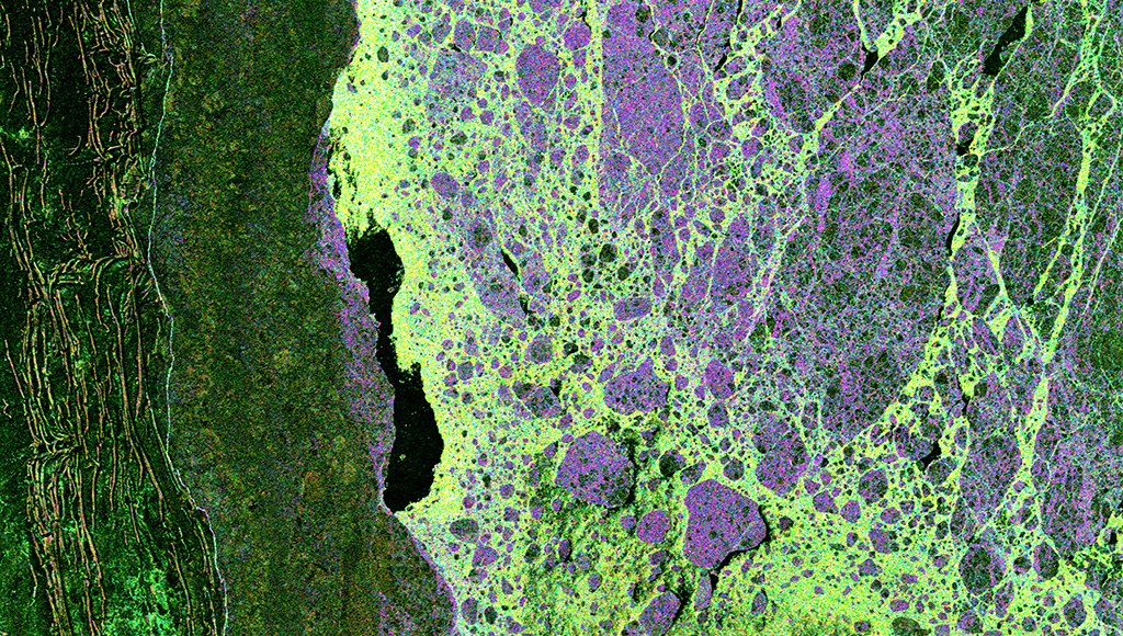 The Tagebau Hambach lignite mine in Germany dominates the top of this RADARSAT-2 image. Satellites like RADARSAT-2 are used by the mining industry to monitor ground movements. (Credit: RADARSAT-2 Data and Products © MacDonald, Dettwiler and Associates Ltd. 2013 – All Rights Reserved. RADARSAT is an official mark of the Canadian Space Agency)