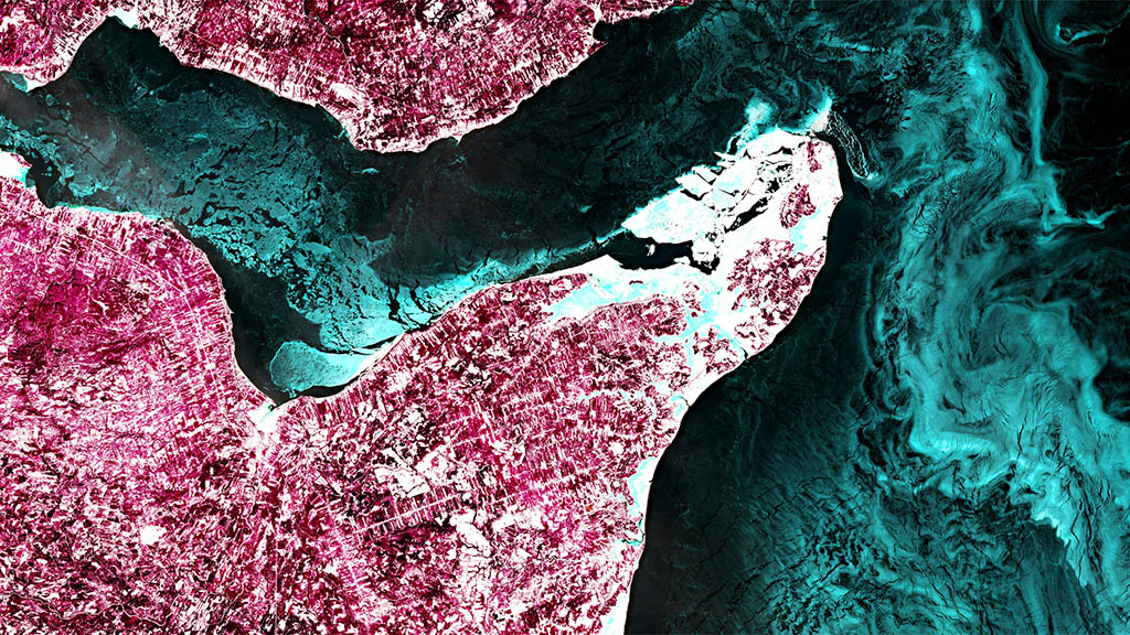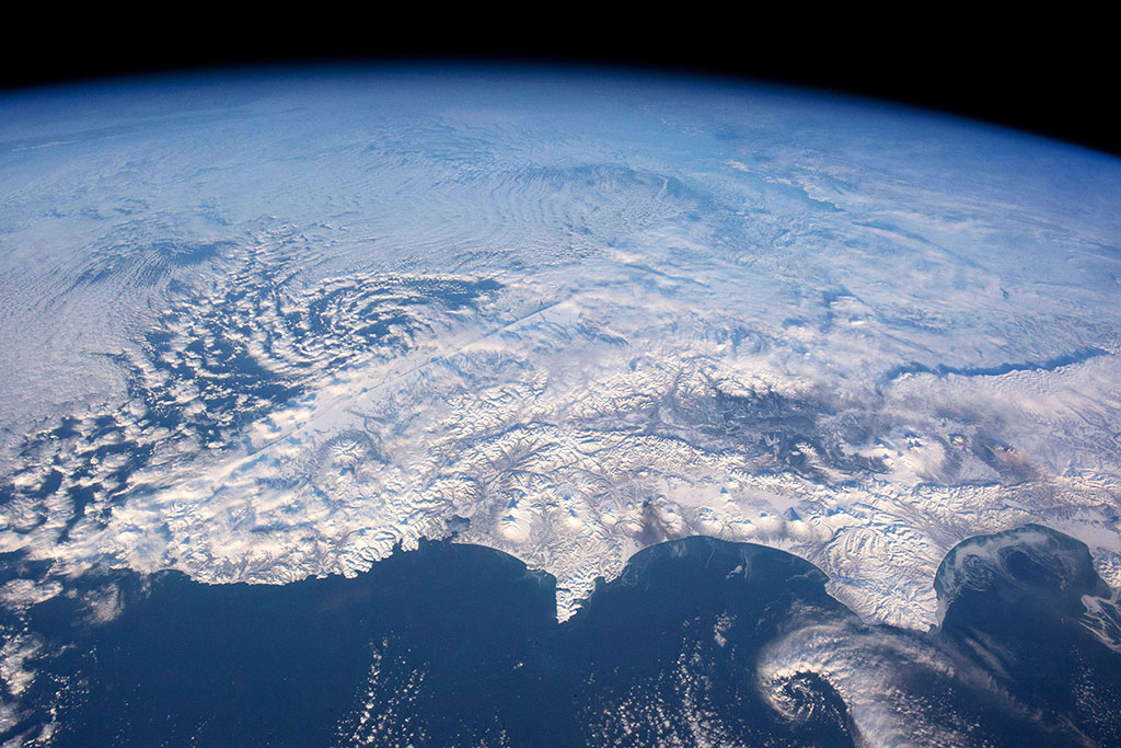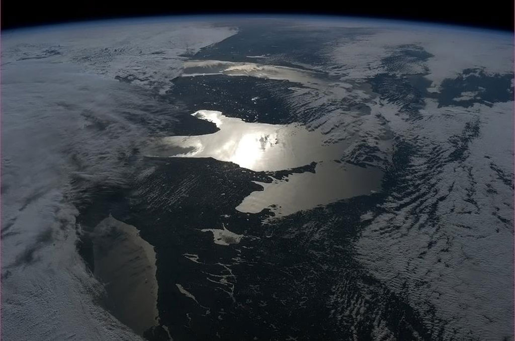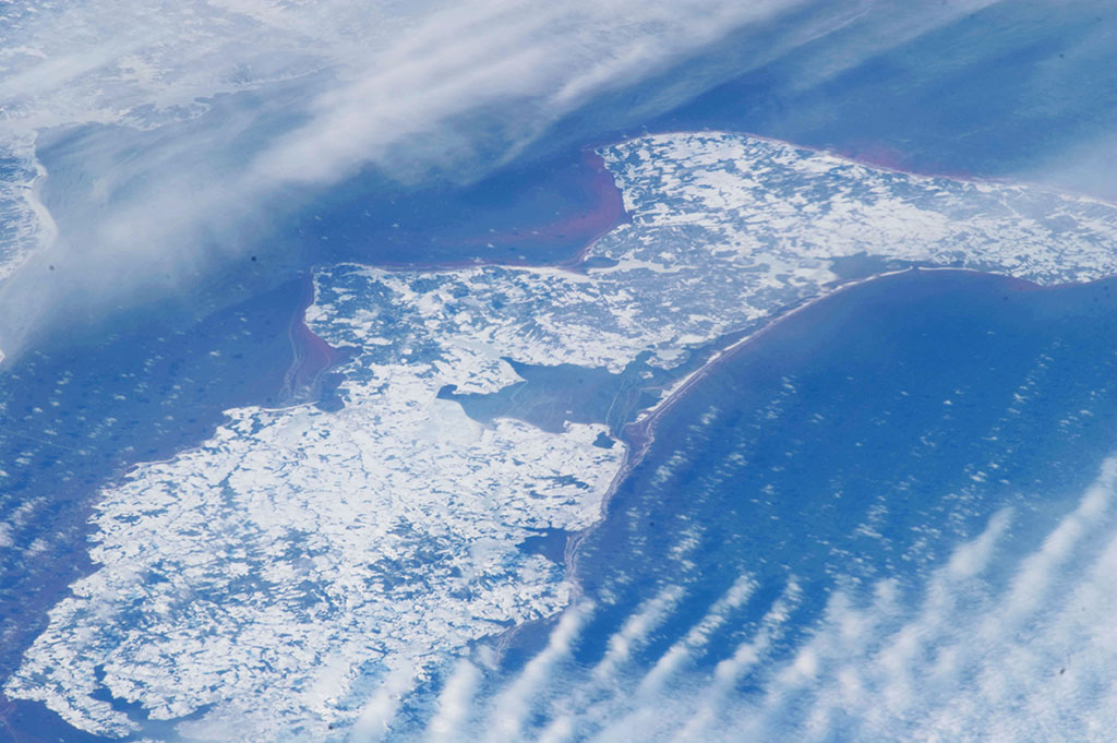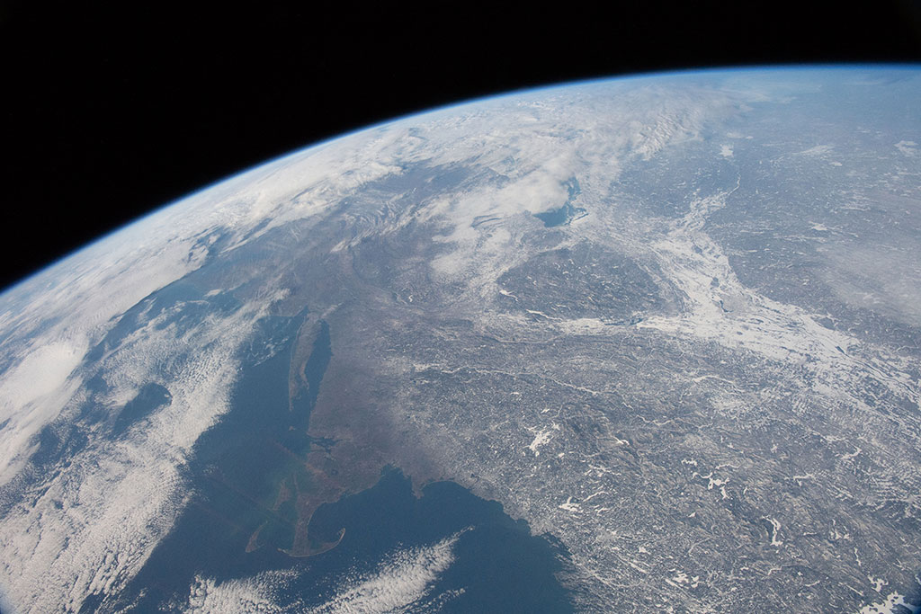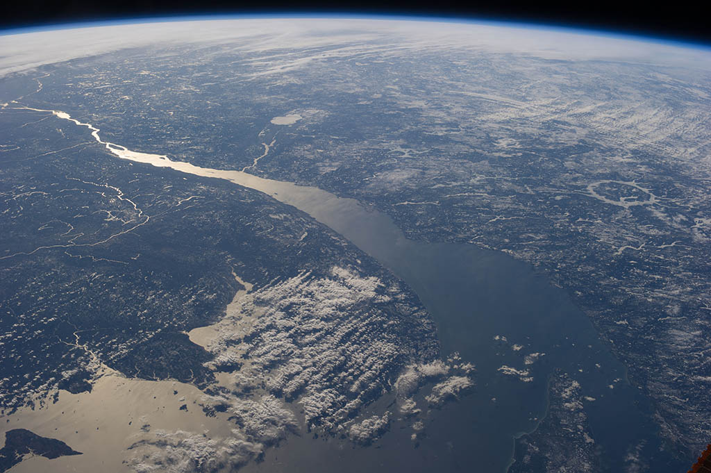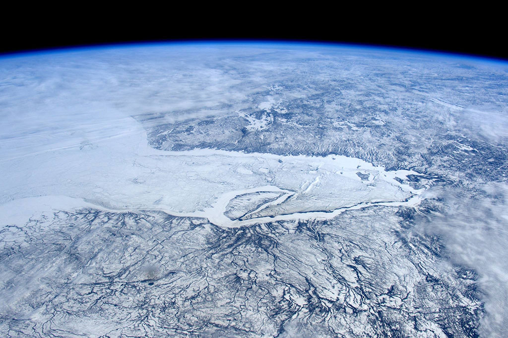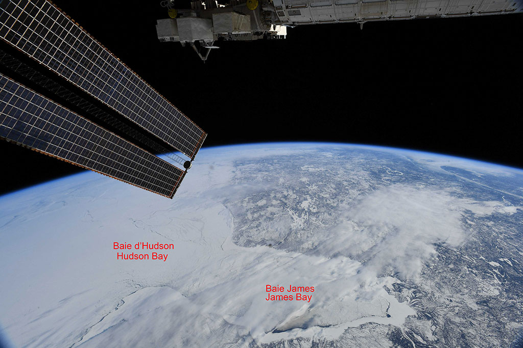 Sea ice is taking over James Bay in this photo taken by David Saint-Jacques from the International Space Station. Akimiski Island seems on the verge of being grabbed by a giant ice hook. (Credit: Canadian Space Agency/NASA)