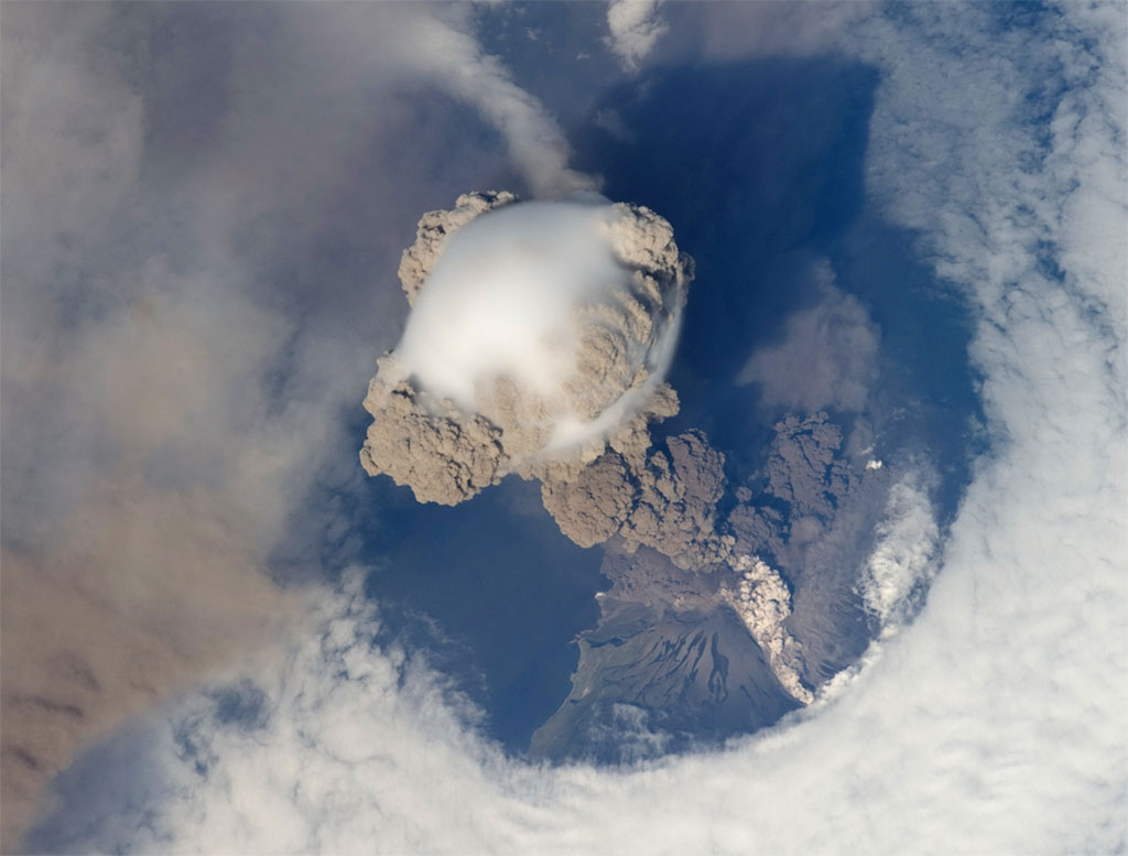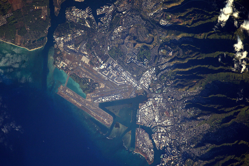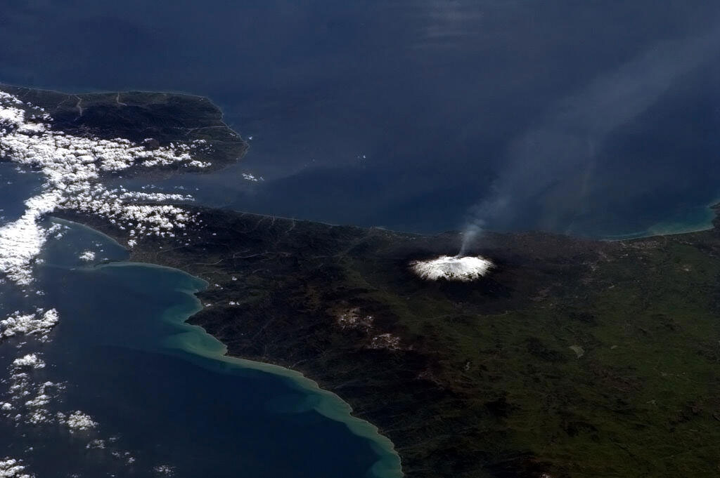 Mauna Kea, captured by David Saint-Jacques from the International Space Station, is one of five volcanoes that form the islands of Hawaii. It is a dormant volcano and its peak is 4,207.3 m above sea level, making it the highest point in the state of Hawaii. Most of the mountain is under water, and when measured from its oceanic base, Mauna Kea is the tallest mountain in the world measuring over 10,000 m. (Credit: Canadian Space Agency/NASA)
