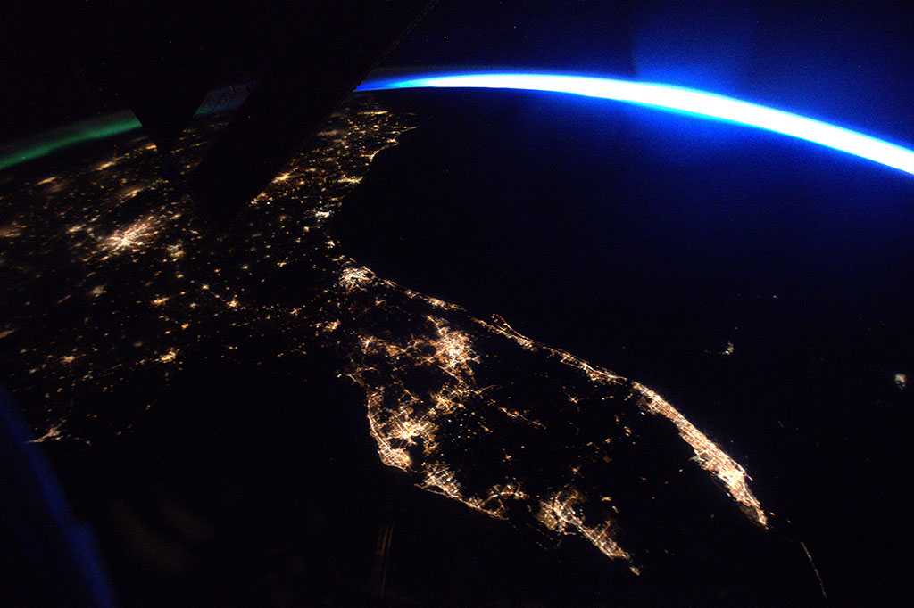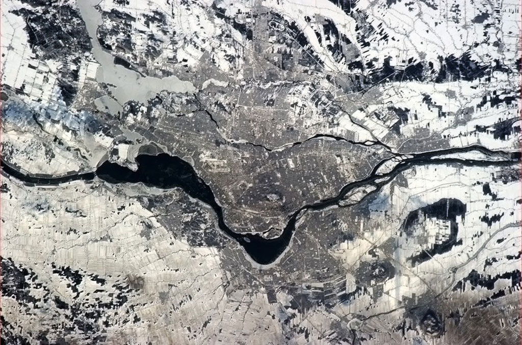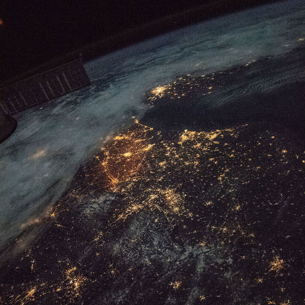 The Toronto-Ottawa-Montreal-Quebec City corridor, where approximately 50% of Canada's population lives, is visible through a single cupola window of the International Space Station. Although bigger than Montreal, Toronto lights seem paler because of the angle and distance of the station when astronaut David Saint-Jacques captured the photo. (Credit: Canadian Space Agency/NASA)