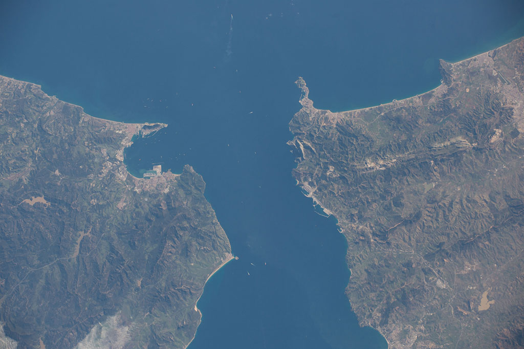 The Atlantic Ocean waters flow through the Strait of Gibraltar, where Europe and Africa meet, into the Mediterranean Sea. Spain is to the north (top) and Morocco to the south in this photo taken from the International Space Station by David Saint-Jacques. (Credit: Canadian Space Agency/NASA)