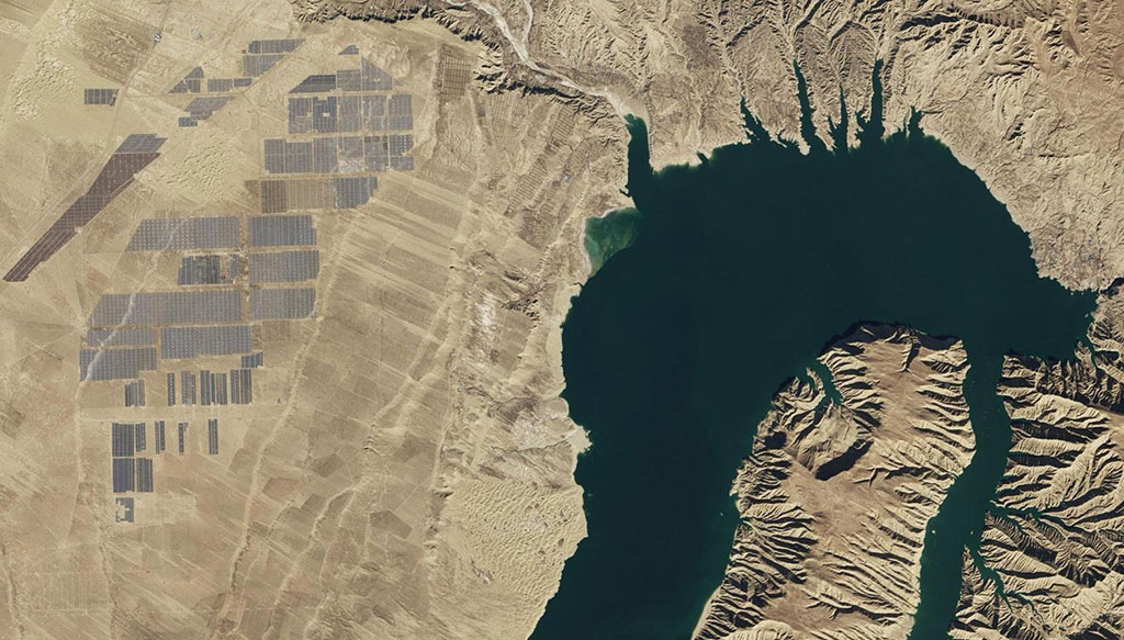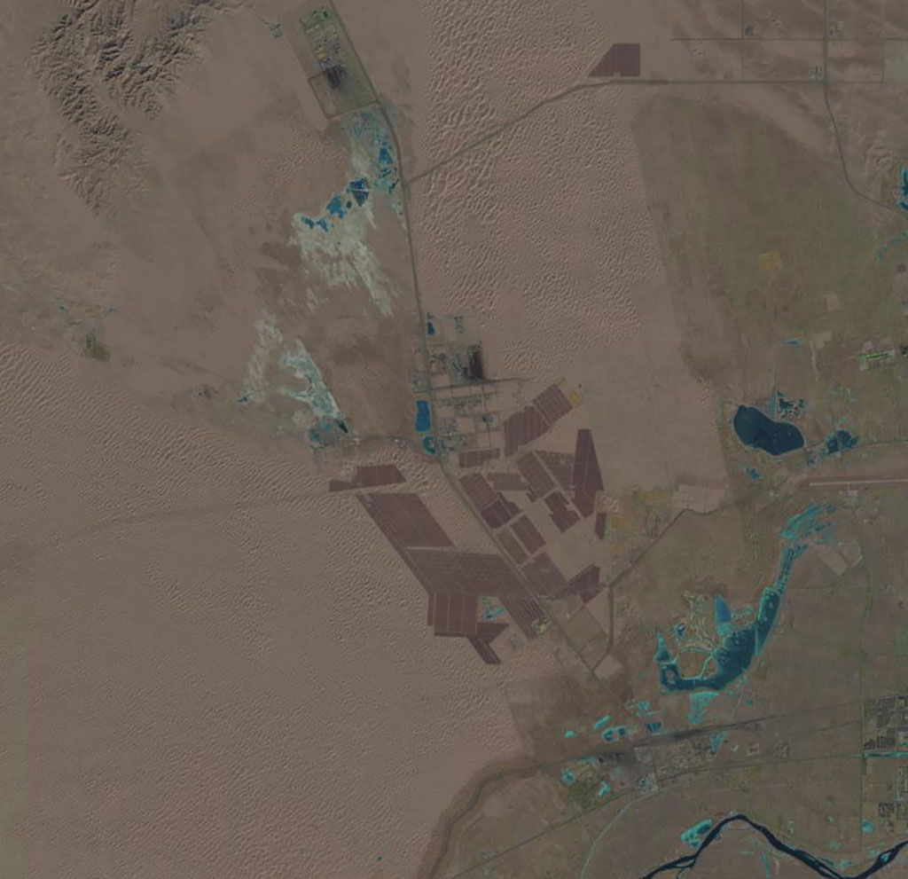 Change description for: Topaz Solar Farm, in southern California, is one of the largest photovoltaic power plants in the world. This image was captured by the American Landsat 8 satellite. Solar arrays appear gray and charcoal. The surrounding farmland and grasslands appear brown and green. (Credit: USGS/NASA Landsat)