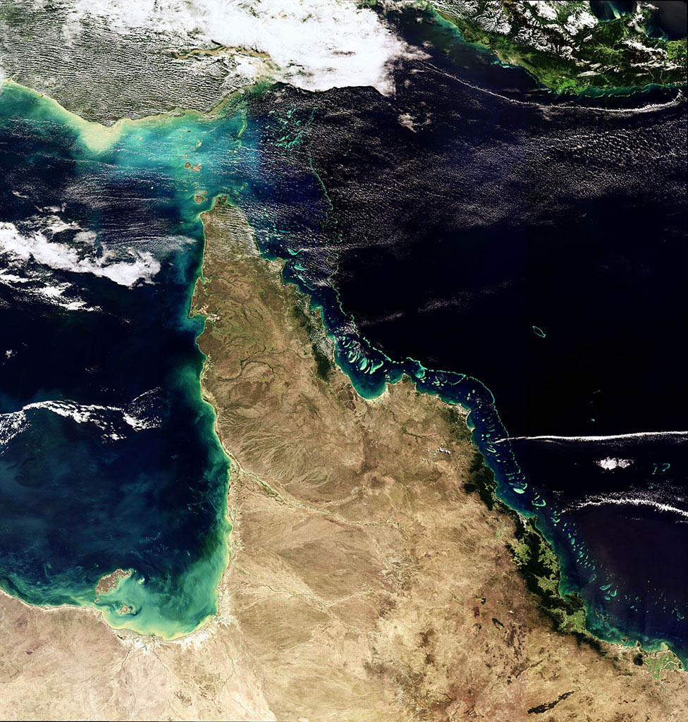 The Great Barrier Reef, a UNESCO World Heritage Site, is the world\'s largest coral reef system composed of over 2,900 individual reefs and 900 islands stretching for over 2,300 kilometres, off the coast of Australia. This photo was taken by French astronaut Thomas Pesquet from the International Space Station. (Credit: European Space Agency)