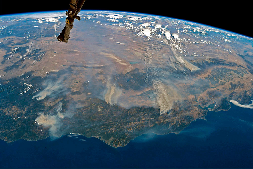 A plume of sand and dust blown from the Sahara desert sweeps over Portugal and Spain. The photo was captured by a crew member of the International Space Station. (Credit: NASA)