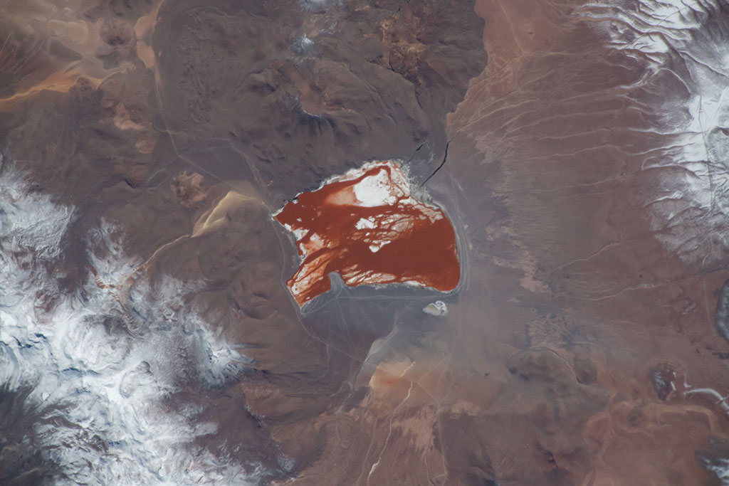 Laguna Colorada is a shallow salt lake in Bolivia, close to the border with Chile. It can easily be seen from space due the reddish color of its waters, caused by red sediments and pigmentation of some algae. The lake also contains borax islands, which appear white and contrast with the water. This photo was taken by David Saint-Jacques from the International Space Station. (Credit: Canadian Space Agency/NASA)