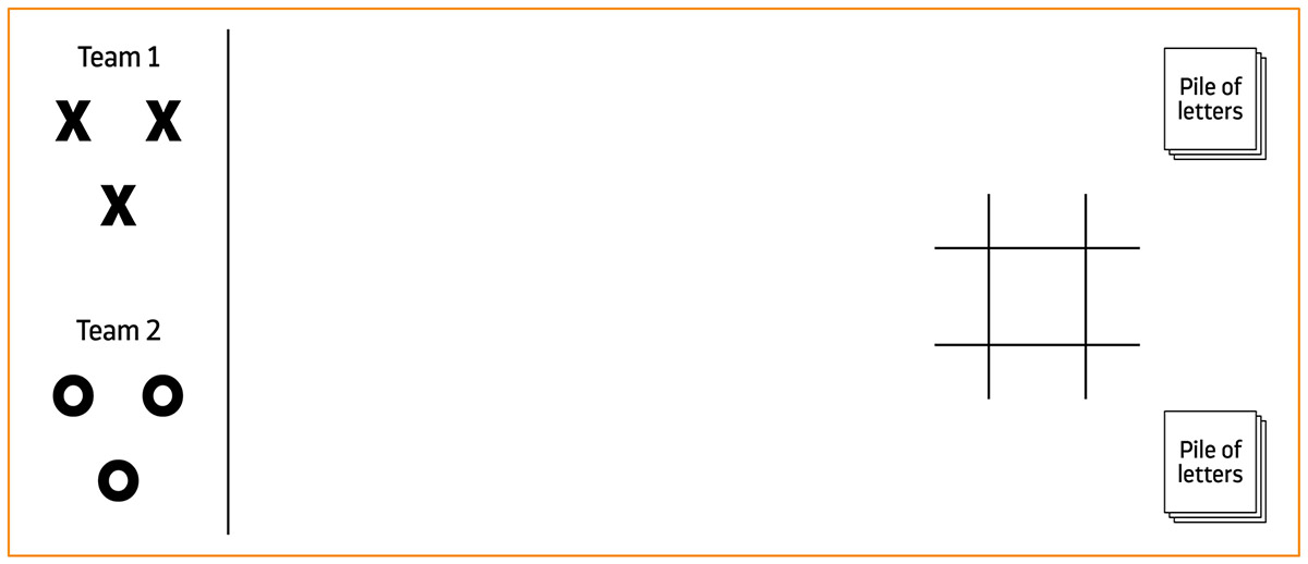- Position two piles of letters for each team near the tic-tac-toe board.