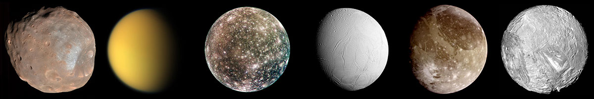 On trouve dans le Système solaire des lunes d'apparence très variée. De gauche à droite : Phobos, Titan, Callisto, Encelade, Ganymède et Miranda. (Source : NASA.)