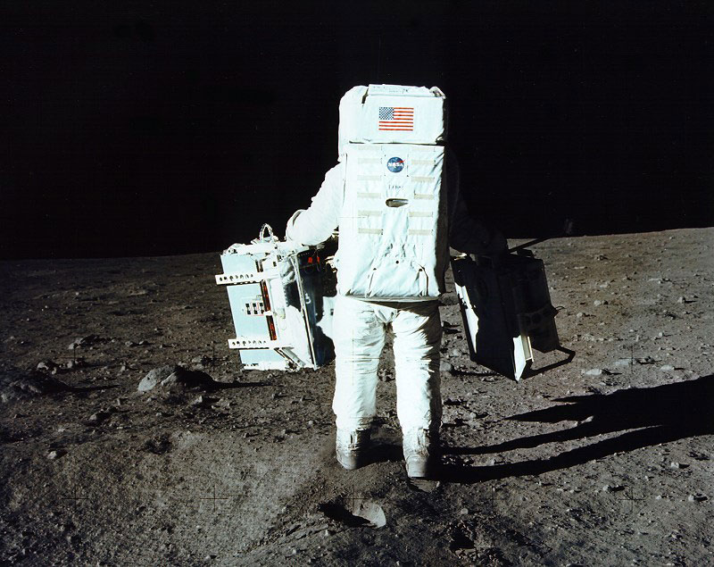Un astronaute d'Apollo 11 transporte du matériel scientifique sur la Lune. (Source : NASA.)