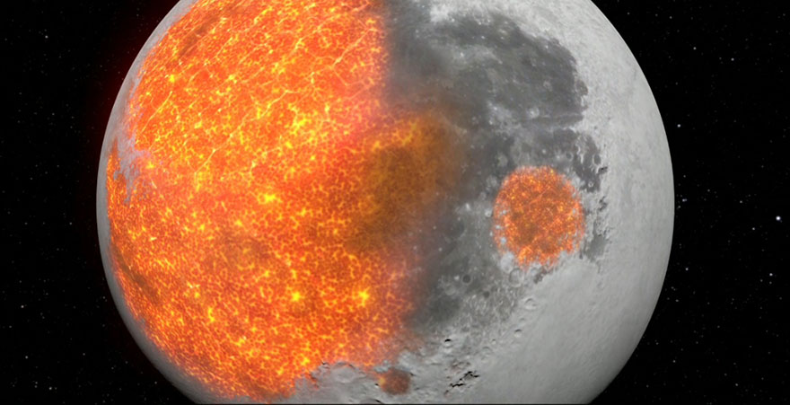 ! : point d'exclamation pour relever certains éléments qui pourraient susciter de la confusion chez les jeunes : De la Terre, on distingue de grandes étendues foncées à la surface de la Lune que l'on appelle mers. Contrairement à ce que croyaient autrefois les astronomes, il ne s'agit pas d'étendues d'eau, mais plutôt de vastes plaines de lave refroidie. Elles ont probablement été créées à la suite d'énormes bombardements de météorites qui ont permis de mettre une partie de la Lune en fusion, ce qui a créé de grandes étendues de roche fondue.