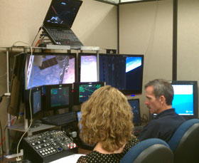 Au Centre spatial Johnson de la NASA à Houston au Texas, Chris Hadfield s'exerce à manœuvrer le Canadarm2 pour saisir un engin spatial en vol libre et l'amarrer à la Station spatiale internationale. (Source : NASA)