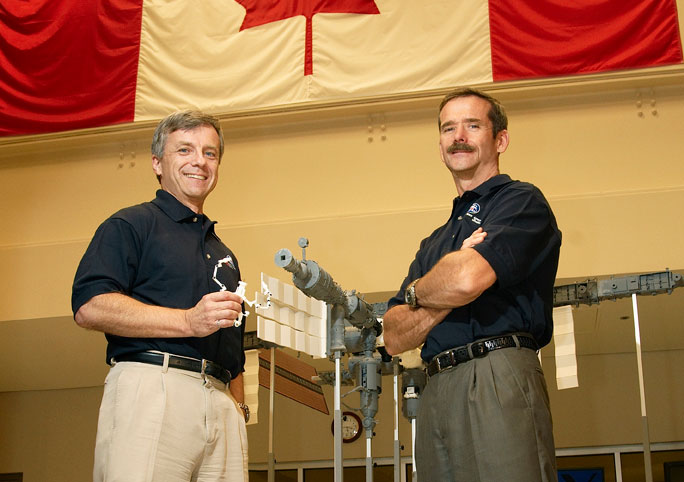 Les astronautes canadiens Bob Thirsk et Chris Hadfield aux installations de formation en robotique de l'Agence spatiale canadienne. (Source : ASC.)
