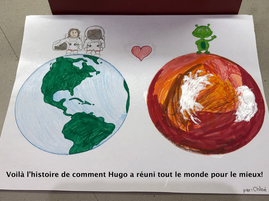 Par contre, les autres pensaient qu'Hugo était étrange. C'est pourquoi il était souvent seul, accroupi, comme il l'était ce jour-ci. Cette journée-là, Hugo était caché dans le bureau de son papa. Il y avait un ordinateur, une chaise et un cabinet rempli jusqu'au plafond. Silencieusement, Hugo cherchait des photos prises sur Terre. Après un bout de temps, Hugo trouva une photo qui montrait deux personnes, déguisées en gros vêtements blancs, portant de gros casques. Ils n'avaient pas l'air comme des Martiens du tout! « Ça doit être des humains, s'exclama Hugo, ils sont plus différents que je les imaginais… Pourtant, ils n'ont pas l'air très méchants, comme mon papa le disait. »