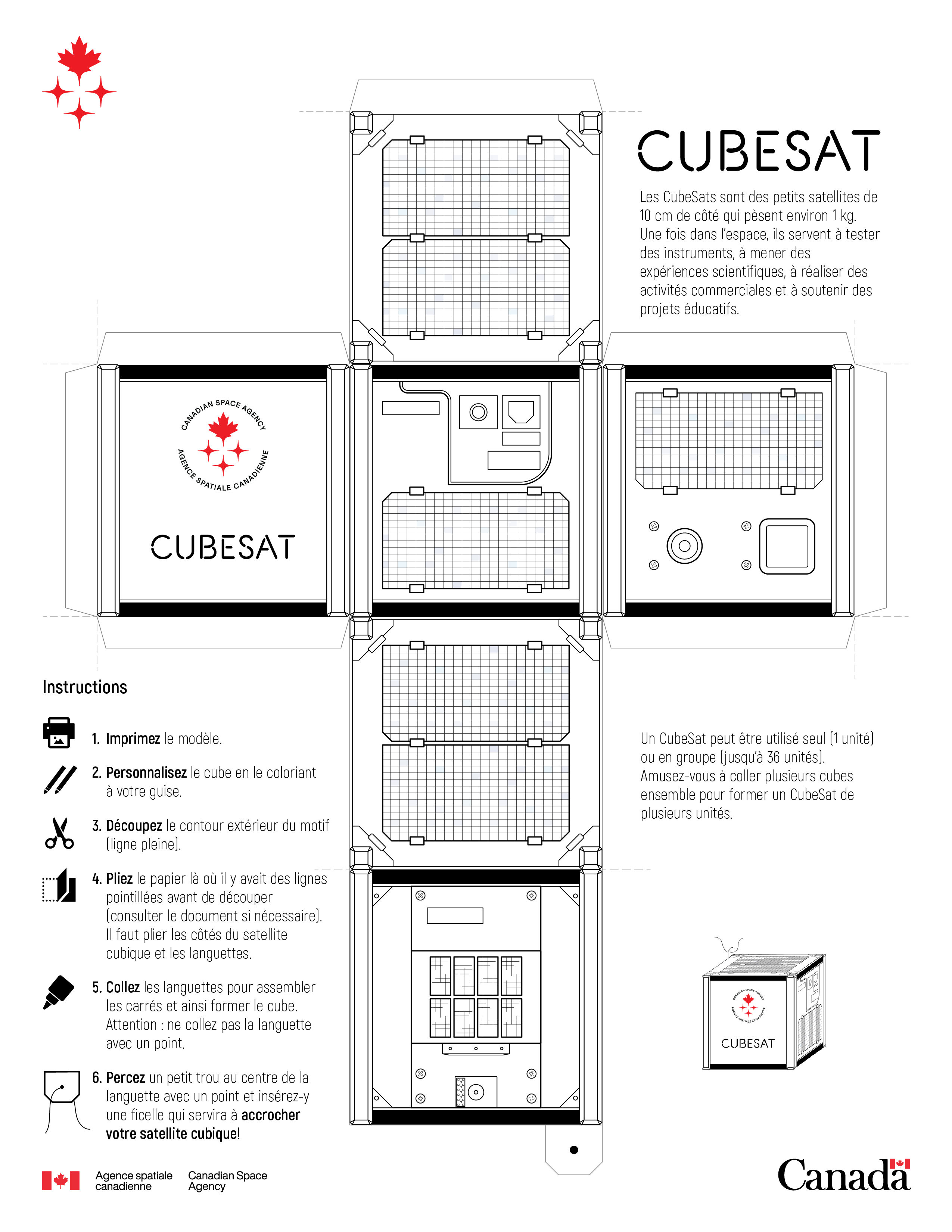 Illustration d'une maquette d'un petit satellite cubique. Sur l'un des six carrés se trouve le nom CubeSat et le logo de l'Agence spatiale canadienne. À l'extérieur de la maquette se trouvent les instructions accompagnés des infographies suivantes : une imprimante, deux crayons, une paire de ciseaux, une feuille pliée en deux, le bout d'un marqueur, et une étiquette trouée dans laquelle se trouve une ficelle. On y voit aussi un court descriptif du modèle, ainsi qu'une représentation du cube assemblé.