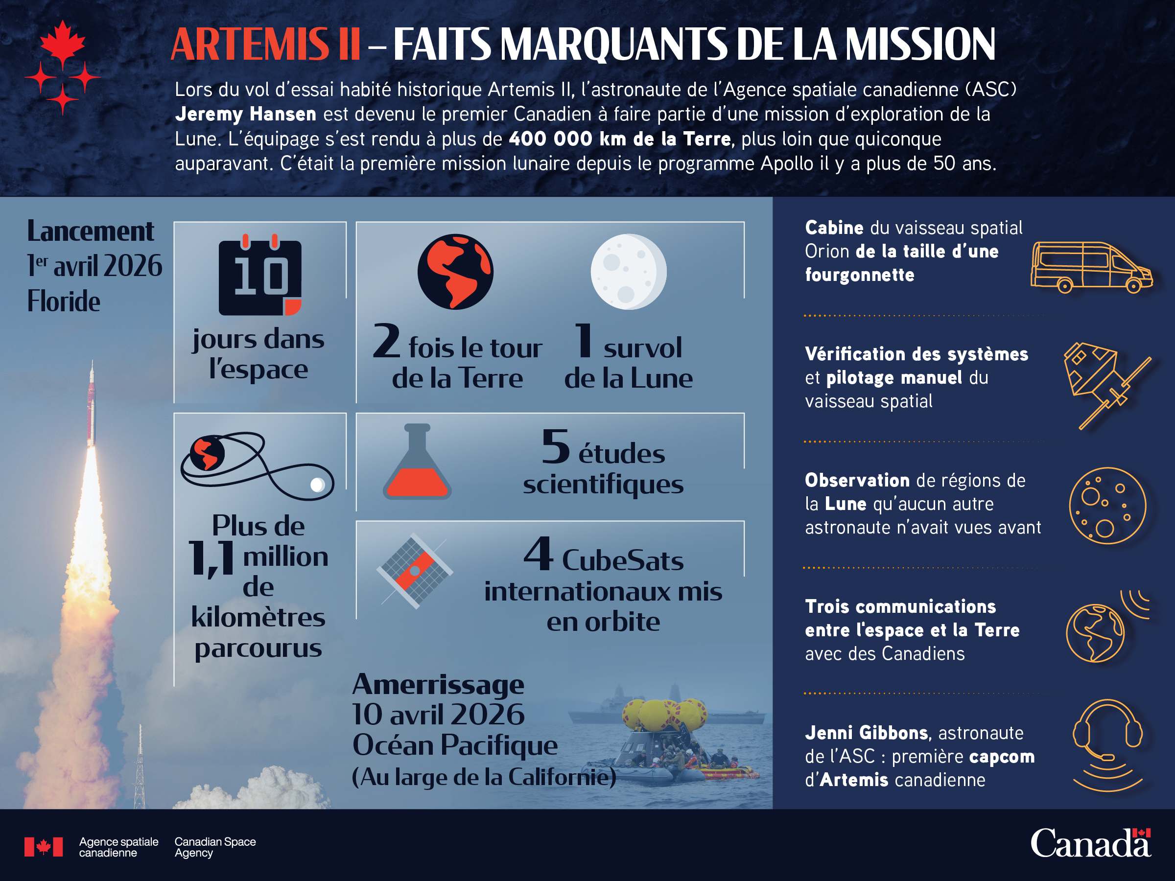 Représentation graphique des faits marquants de la mission Artemis II. Le résumé suivant se trouve en haut : Lors du vol d'essai habité historique Artemis II réalisé du 1ᵉʳ au 10 avril 2026, l'astronaute de l'Agence spatiale canadienne Jeremy Hansen est devenu le premier Canadien à faire partie d'une mission d'exploration de la Lune. L'équipage s'est rendu à plus de 400 000 km de la Terre, plus loin que quiconque avant eux. C'était la première mission lunaire depuis le programme Apollo il y a plus de 50 ans.