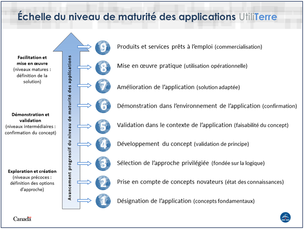 L'avancement progressif du niveau de maturité des applications UtiliTerre est constitué de neuf niveaux. Les premiers niveaux, aussi qualifiés de précoces, définissent les options d'approche. Les niveaux intermédiaires confirment le concept retenu et finalement les niveaux dits matures définissent la solution. Ces trois étapes peuvent se décrire comme suit :
