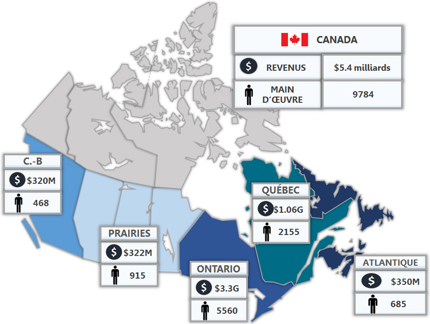 Pour ce qui est de la contribution aux revenus du gouvernement, le sondage annuel de l'ASC ne recueille pas de données sur la fiscalité des entreprises et, en raison de la nature intersectorielle du secteur spatial, il est impossible d'obtenir des estimations fiables à partir des résultats du modèle intrants-extrants personnalisé. Cependant, l'analyse des états financiers publics des compagnies qui génèrent des revenus spatiaux primaires donne une bonne idée des niveaux de fiscalité directe des entreprises. Des estimations des salaires (revenus personnels) appuyés par le secteur spatial canadien ont été calculées par une analyse des salaires moyens de chacune des classifications industrielles retenues (SCIAN) et de leurs nivaux salariaux correspondants, fournis par Statistique Canada. On a ensuite estimé les impôts en fonction des taux provinciaux et fédéraux correspondants, en respectant la distribution provinciale des emplois dans le secteur spatial. Enfin, des estimations de l'imposition indirecte, ce qui comprend la taxe de vente sur les biens intermédiaires, les droits d'accise, les taxes foncières et autres, ont été adaptées à partir des multiplicateurs personnalisés d'entrants-extrants.