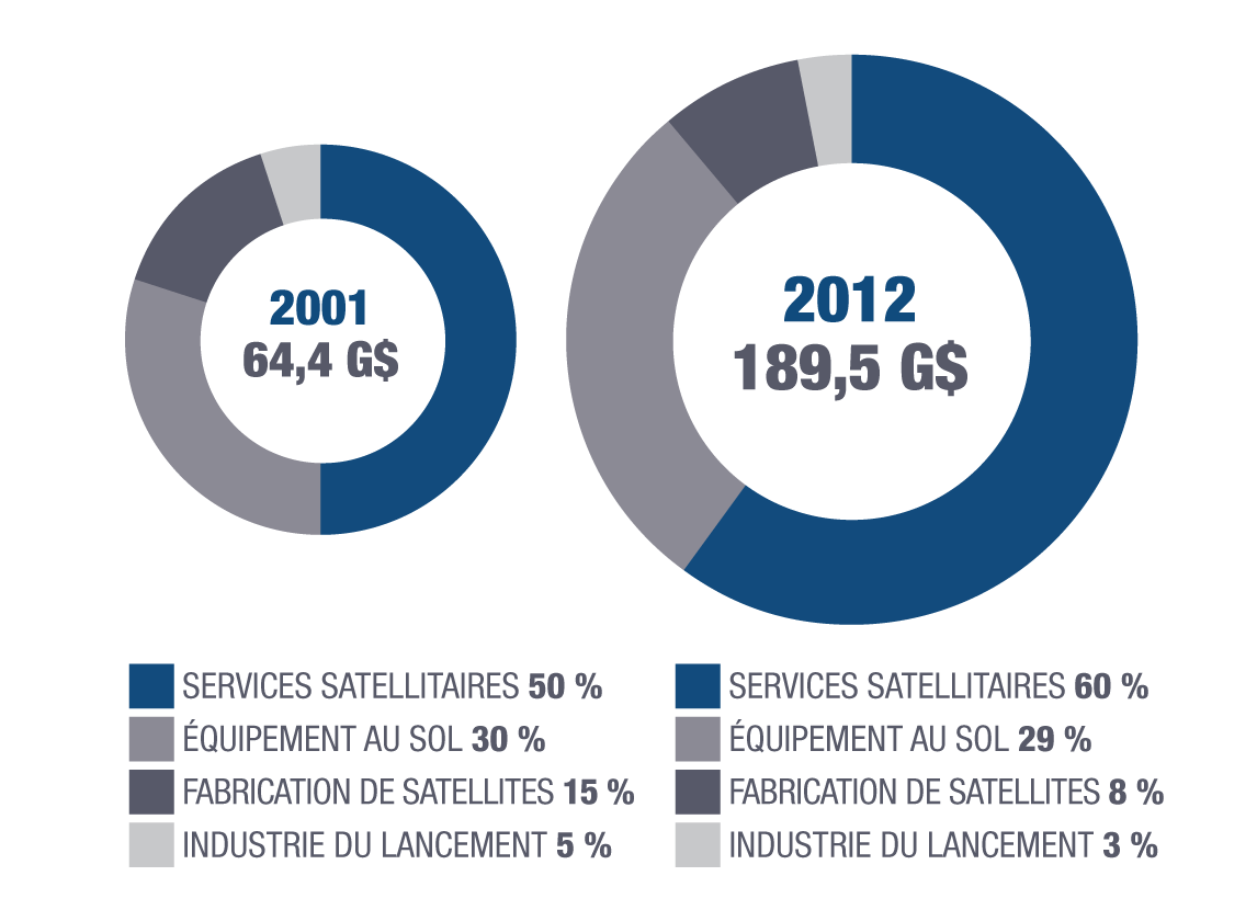 Les revenus de l'industrie mondiale des satellites ont presque triplé depuis 2001, avec une hausse moyenne de 10 % par année. En 2012, les communications satellitaires au Canada comptaient pour 80 % des revenus du secteur spatial, soit un total de 2,66 milliards de dollars.