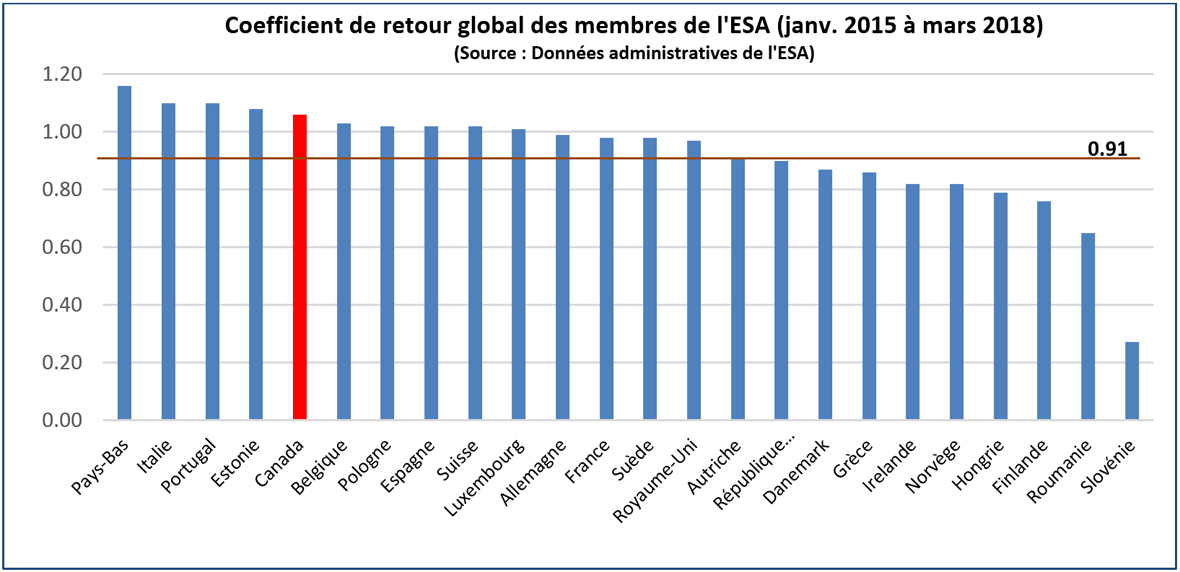 Pour calculer le coefficient de retour industriel, l'ESA utilise actuellement une période de déclaration allant du au , avec un objectif provisoire minimal de 0,91 pour le coefficient de retour global à atteindre par tous les États membres d'ici le . Au , le Canada a dépassé cet objectif, avec un coefficient de rendement global de 1,06.