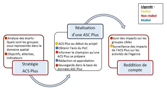 En réponse aux priorités, aux directives et aux exigences du gouvernement fédéral, l'ASC a nommé en une championne de l'ACS Plus parmi ses cadres supérieurs pour diriger l'élaboration et la mise en œuvre des pratiques relatives à l'ACS Plus à l'Agence. En , cette dernière a élaboré une Politique sur l'ACS+ officielle pour veiller à ce que « les valeurs canadiennes et les engagements du gouvernement en matière de progrès vers l'égalité entre les sexes soient reflétés dans l'élaboration et la mise en œuvre des politiques et des programmes à l'ASC » (ASC, 2017a). Dans le cadre de cette politique, l'ASC s'engage à intégrer l'ACS Plus à ses processus de prise de décision et exige que toutes les initiatives de l'ASC (p. ex., politiques, programmes, projets, subventions et contributions, propositions budgétaires), nouvelles ou nécessitant une nouvelle approbation, fassent l'objet d'une ACS Plus pour s'assurer qu'elles n'engendrent pas d'effets néfastes sur divers groupes de femmes, d'hommes et de personnes non binaires.