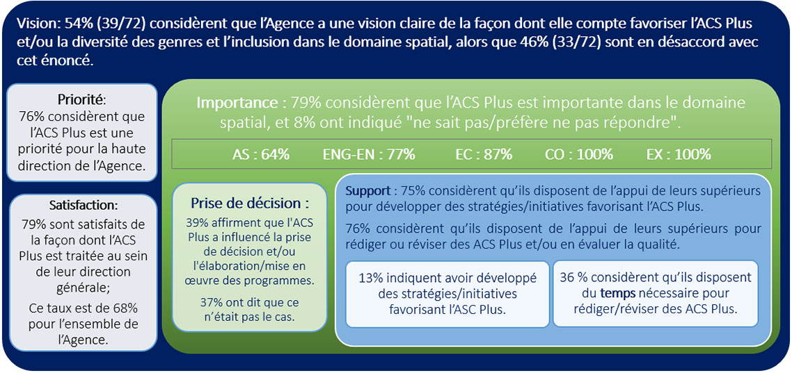 L'ASC « a pour mission de promouvoir l'exploitation et l'usage pacifiques de l'espace, de faire progresser la connaissance de l'espace au moyen de la science et de faire en sorte que les Canadiens tirent profit des sciences et techniques spatiales sur les plans tant social qu'économique » (L.C. 1990). Pour ce faire, elle oriente principalement ses activités vers les milieux académique, scientifique et de l'industrie, et plus précisément vers les jeunes, les étudiants, les chercheurs et les entreprises œuvrant dans le secteur aérospatial. Ce dernier est axé sur les domaines des sciences, technologie, ingénierie et mathématiques (STIM). Toutefois, tel que mentionné dans les analyses ACS Plus examinées, il s'agit d'un domaine où les femmes, les Autochtones, les minorités visibles et les personnes en situation de handicap sont sous-représentées. De plus, près de la moitié des répondants ont mentionné qu'il était difficile d'identifier les besoins des populations cibles de l'ASC à cause du manque de données ventilées relatives au secteur spatial canadien. Les données récoltées ont néanmoins mis en relief la nécessité d'offrir à tous une véritable égalité des chances en termes d'opportunités et de bénéfices. Plus précisément, trois principaux besoins interreliés ont été identifiés relativement à ce sujet, c'est-à-dire