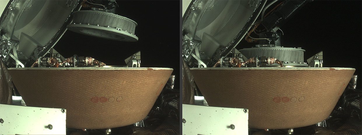 À gauche, la tête d'échantillonnage d'OSIRIS-REx se trouve au-dessus de la capsule de retour d'échantillon (SRC), placée dans la bonne position avec le TAGSAM (bras robotisé). À droite, la tête d'échantillonnage est fixée à l'anneau de la SRC prévu à cet effet. Les deux images ont été captées par la StowCam. (Source : NASA/Goddard/Université de l'Arizona/Lockheed Martin.)