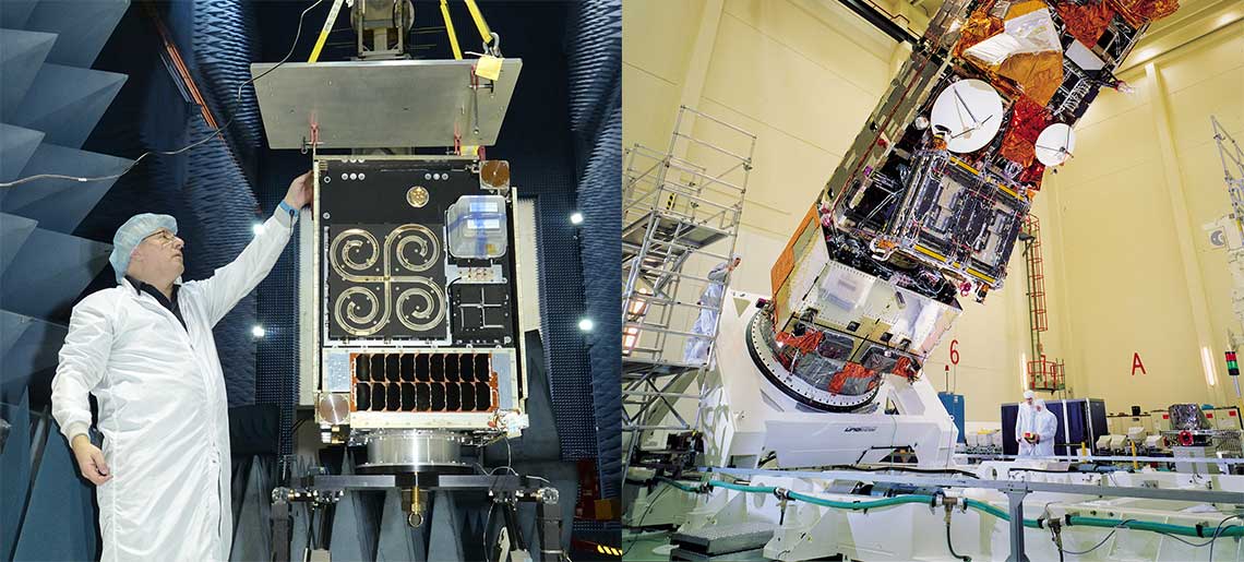 Les satellites M3MSat (à gauche) et Envisat (à droite). On a un bon aperçu de la taille de ces satellites en les comparant avec les scientifiques qui se trouvent à côté. (Sources : Recherche et développement pour la défense Canada et Agence spatiale européenne.)